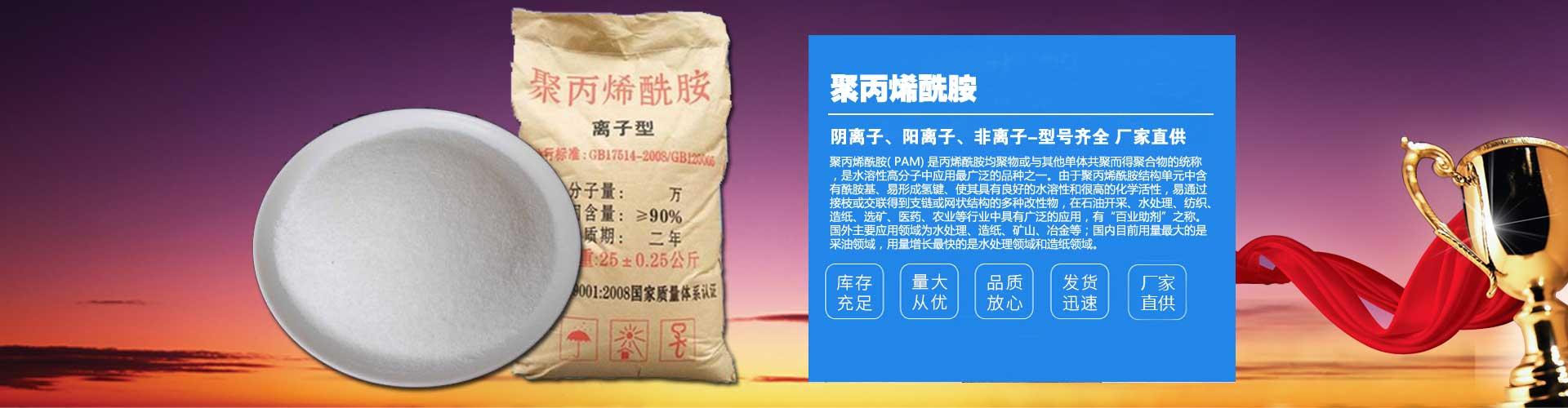 公司主要生產水處理絮凝劑聚丙烯酰胺、培菌醋酸鈉(乙酸鈉)等產品,廣泛應用于城市自來水、市政污水、化工能源、生物醫藥,造紙紡織、鋼鐵電力等行業的污水處理!